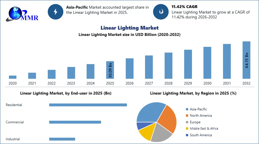 The Linear Lighting Market was valued at 30.09Bn in 2025, and total Linear Lighting Market revenue is expected to grow at a CAGR of 11.42% from 2025 to 2032, reaching nearly USD 64.15 Bn.