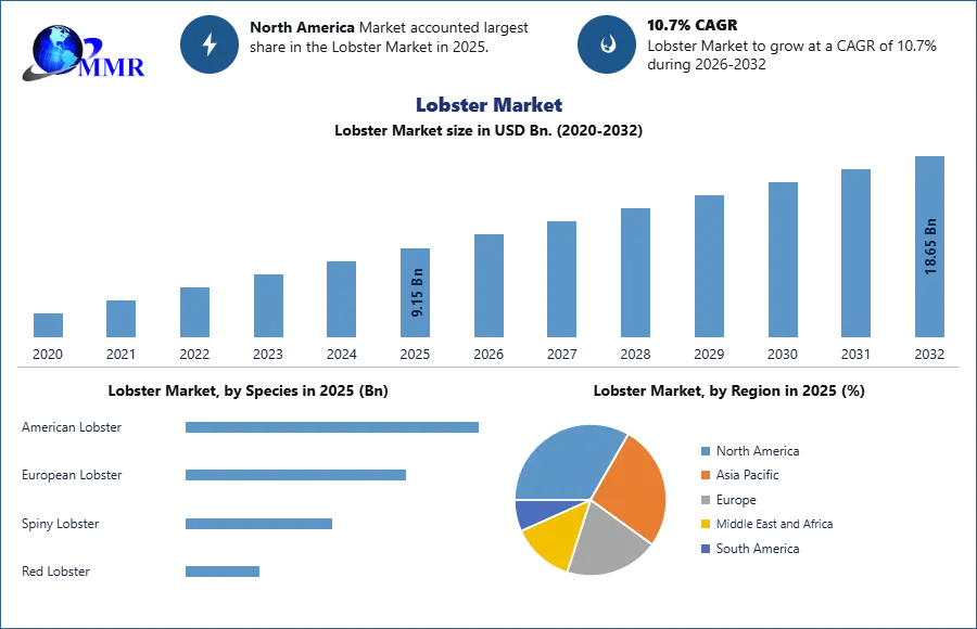 The Lobster Market size was valued at USD 9.15 Billion in 2025 and the total Lobster revenue is expected to grow at a CAGR of 10.7% from 2026 to 2032, reaching nearly USD 16.85 Billion.