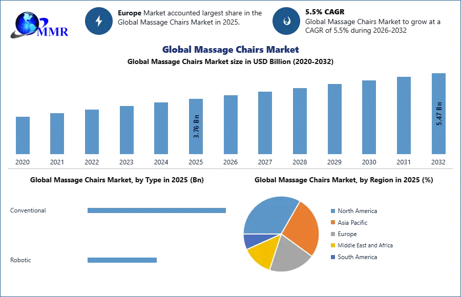 Massage Chairs Market size was valued at USD 3.76 Billion in 2025 and is expected to grow at a CAGR of 5.5 percent from 2026 to 2032 to reach USD 5.47 Billion by 2032.