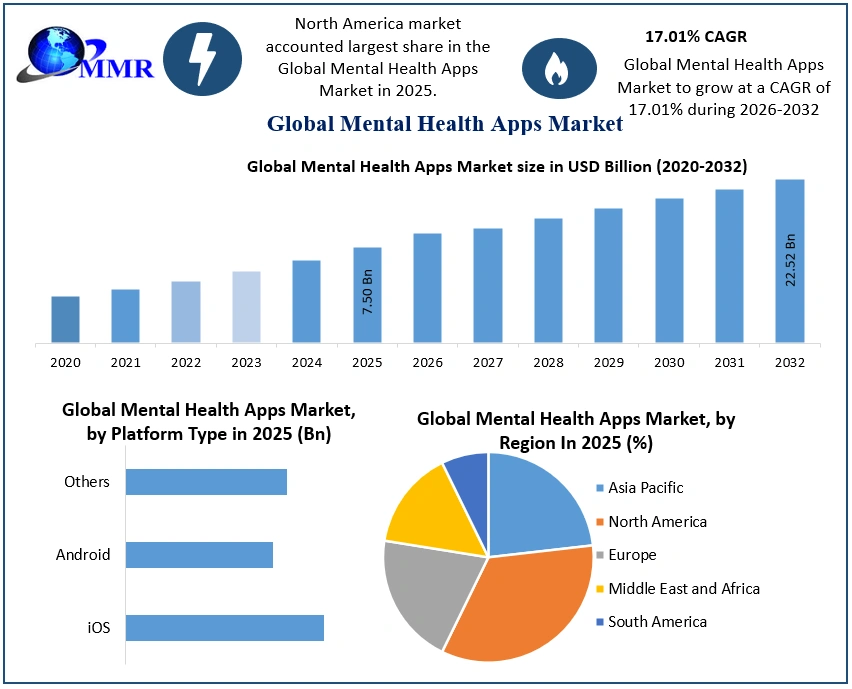 Global Mental Health Apps Market Report Coverage Details Base Year: 2025 Forecast Period: 2026-2032 Historical Data: 2020 to 2025 Market Size in 2025: USD 7.50 Bn. Forecast Period 2026 to 2032 CAGR: 17.01% Market Size in 2032: USD 22.52 Bn. Segments Covered: By Platform Type iOS Android Others By Subscription Type Free Apps Paid Apps By Accessibility and Engagement Mobile Apps Web-Based Apps Gamified Apps By Application Depression & Anxiety Management Meditation Management Stress Management Wellness Management Addiction Disorder Others Mental Health Apps Market, by Region