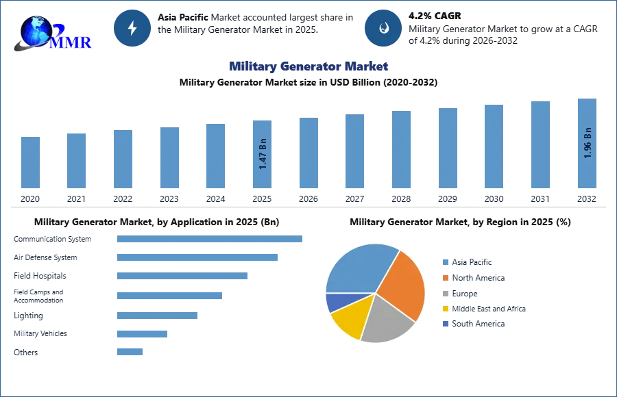 The Military Generator Market size was valued at USD 1.47 Billion in 2025 and the total Military Generator Market revenue is expected to grow at a CAGR of 4.2% from 2026 to 2032, reaching nearly USD 1.96 Billion.