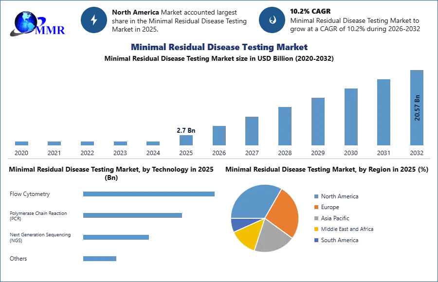 The Minimal Residual Disease Testing Market size was valued at USD 2.7 Billion in 2025 and the total Minimal Residual Disease Testing Market revenue is expected to grow at a CAGR of 10.2% from 2026 to 2032, reaching nearly USD 20.57 Billion by 2032.