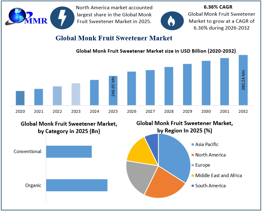 Global Monk Fruit Sweetener Market Report Coverage Details Base Year: 2025 Forecast Period: 2026-2032 Historical Data: 2020 to 2025 Market Size in 2025: USD 246.95 Mn. Forecast Period 2026 to 2032 CAGR: 6.36% Market Size in 2032: USD 380.24 Mn. Segments Covered: by Form Liquid Form Powdered Form by Category Organic Conventional by Application Food and Beverages Bakery and Confectionery Pharmaceutical Others Monk Fruit Sweetener Market, by Region: