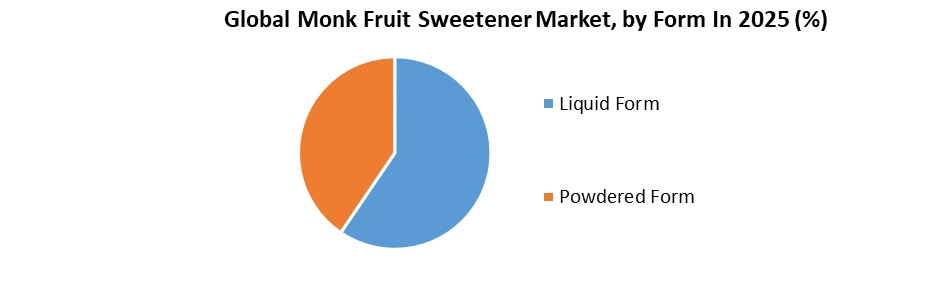 Based on form, the monk fruit sweetener market is segmented into liquid and powder form. Monk fruit sweetener in powder form held the largest share of approximately xx% in 2025, due to its versatility and wide use in various applications. The powdered form of monk fruit sweetener is mainly used in baking, cooking, and processed food products. The powdered form can be used as a direct sugar substitute in a variety of recipes without changing the texture or taste, providing a significant benefit to home cooks and commercial bakers. In addition, it is more stable and easier to store than the liquid form, also contributing to its market dominance. For instance, Lakanto, a well-known brand in the monk fruit sweetener industry, has successfully expanded its product line with powdered monk fruit sweetener, targeting healthy consumers looking for a variety of sugars. The popularity of monk fruit sweetener powder has increased with the growing demand for low-calorie, natural sweeteners in the food and beverage industry. Major food companies are increasingly using fruit sweetener powders in products such as pretzels, butter, and baked goods to meet the growing demand for clean-label, keto-friendly products.![]()