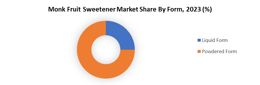 Based on form, the monk fruit sweetener market is segmented into liquid and powder form. Monk fruit sweetener in powder form held the largest share of approximately xx% in 2023, due to its versatility and wide use in various applications. The powdered form of monk fruit sweetener is mainly used in baking, cooking, and processed food products. The powdered form can be used as a direct sugar substitute in a variety of recipes without changing the texture or taste, providing a significant benefit to home cooks and commercial bakers. In addition, it is more stable and easier to store than the liquid form, also contributing to its market dominance. For instance, Lakanto, a well-known brand in the monk fruit sweetener industry, has successfully expanded its product line with powdered monk fruit sweetener, targeting healthy consumers looking for a variety of sugars. The popularity of monk fruit sweetener powder has increased with the growing demand for low-calorie, natural sweeteners in the food and beverage industry. Major food companies are increasingly using fruit sweetener powders in products such as pretzels, butter, and baked goods to meet the growing demand for clean-label, keto-friendly products.![]()