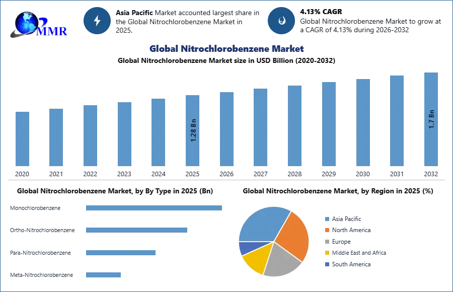 Global Nitrochlorobenzene Market size was valued at USD 1.28 Bn in 2025 and is expected to reach USD 1.7 Bn by 2032, at a CAGR of 4.13% during a forecast period.