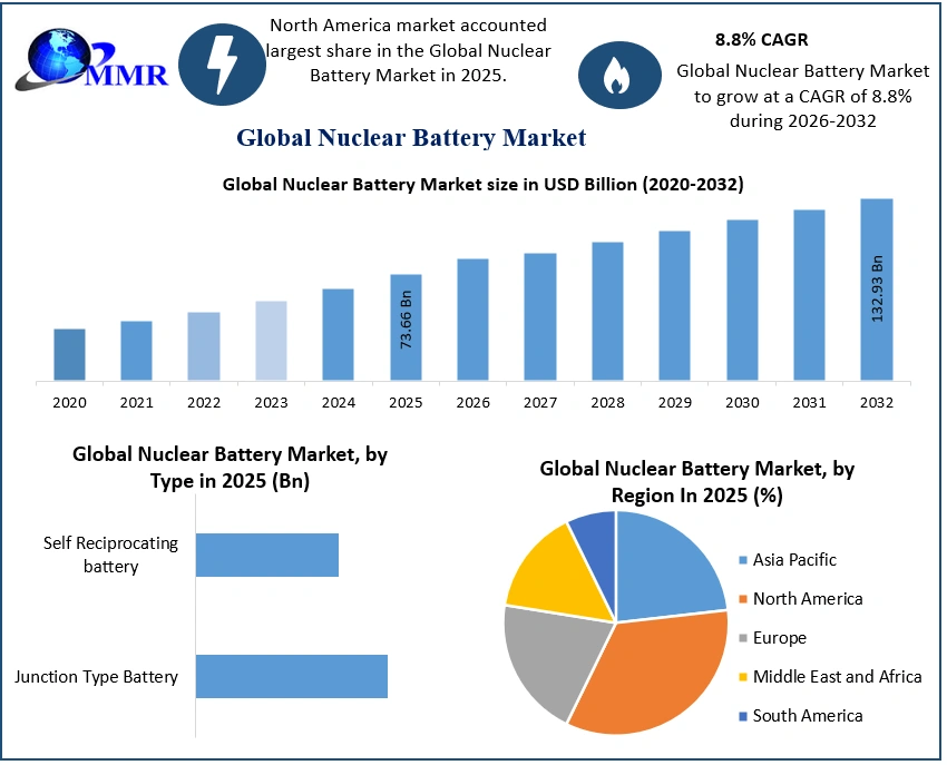 Nuclear Battery Market Report Coverage Details Base Year: 2025 Forecast Period: 2026-2032 Historical Data: 2020 to 2025 Market Size in 2025: USD 73.66 Bn. Forecast Period 2026 to 2032 CAGR: 8.8% Market Size in 2032: USD 132.93 Bn. Segments Covered: by Type Junction Type Battery Self Reciprocating battery by Conversion Thermal Conversion Non-Thermal Conversion by Application Automotive Residential Commercial Industrial Others Nuclear Battery Market, by Region
