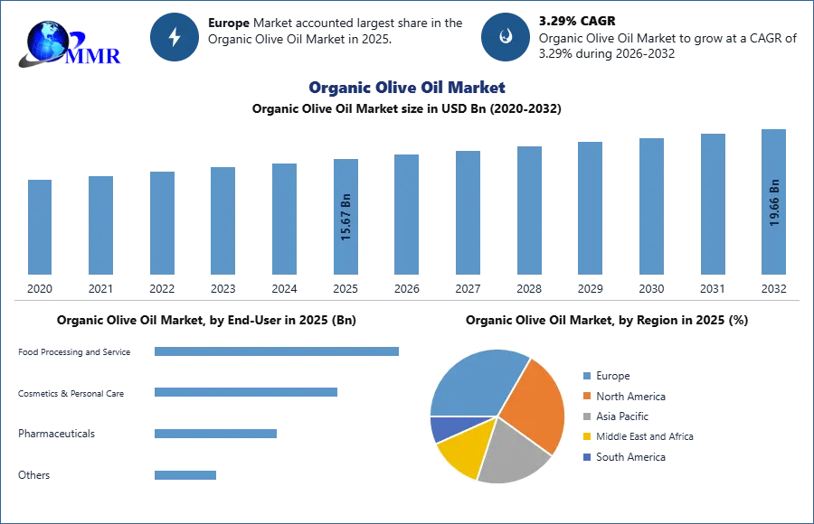 Organic Olive Oil Market size was valued at USD 15.67 Bn in 2025 and expected to reach USD 19.66 Bn by 2032, at a CAGR of 3.29 %