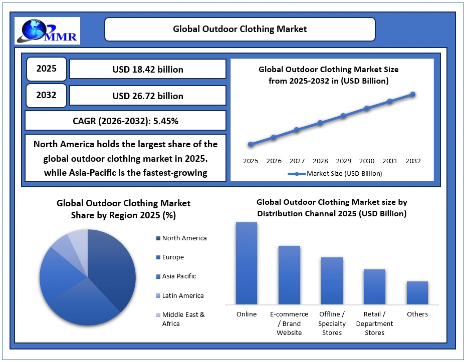 Outdoor Clothing Market Report Coverage Details Base Year: 2025 Forecast Period: 2026-2032 Historical Data: 2020 to 2025 Market Size in 2025: USD 18.42 Bn. Forecast Period 2026 to 2032 CAGR: 5.45% Market Size in 2032: USD 26.72 Bn. Segments Covered: by Apparel Type Casual Wear Fashion Wear Rainy Wear Promotional Apparel Recreational Wear Sports/ Activity Wear Road Running Trail Running Active Life Apparel Hiking Climbing Travel Apparel Swimwear Others