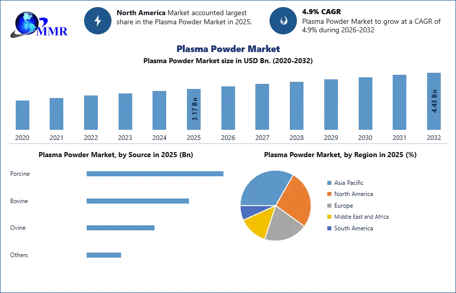 Plasma Powder Market size was valued at USD 3.17 Billion in 2025 and the total Global Plasma Powder Market revenue is expected to grow at a CAGR of 4.9% from 2025 to 2032, reaching nearly USD 4.43 Billion.