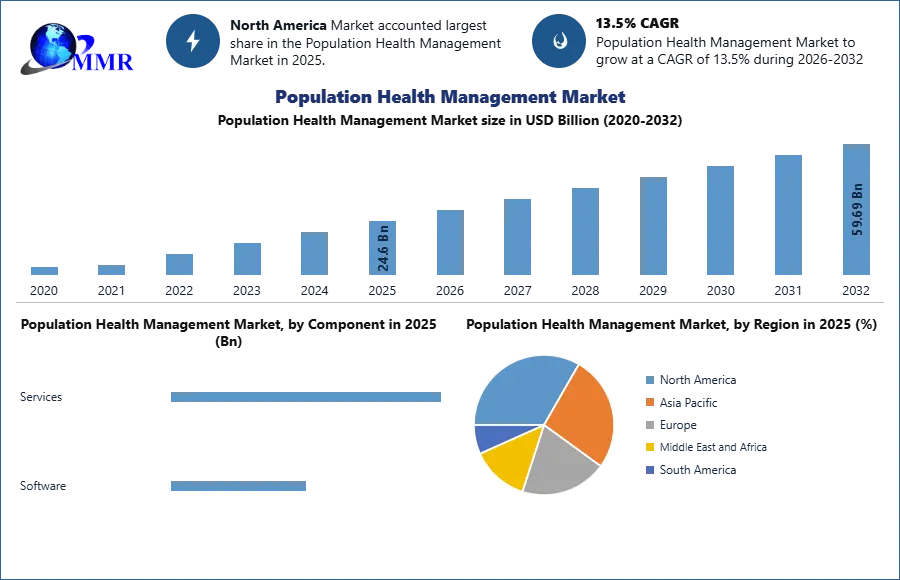 Population Health Management Market was valued at USD 24.6 Bn. in 2025. Global Population Health Management Market size is expected to grow at a CAGR of 13.5% through the forecast period.