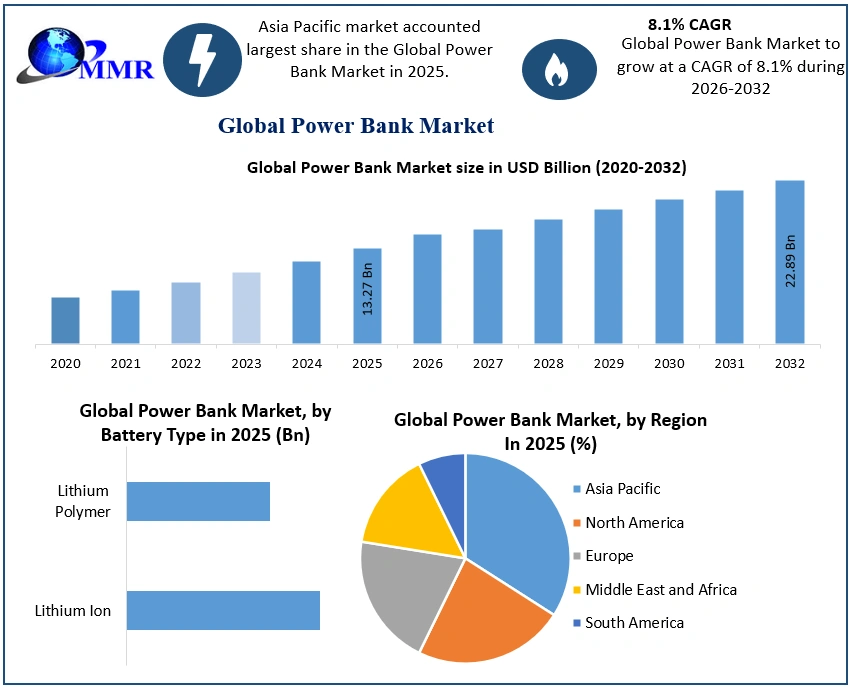 The Global Power Bank market was valued at USD 13.27 Bn. in 2025, and it is expected to reach USD 22.89 Bn. by 2032 with a CAGR of 8.1% during the forecast period. When you're on the go, a power bank can recharge your battery-powered electronics. A power bank can be small enough to fit in your pocket or large enough to hold more power. Cell phones, tablets, speakers, and even computers are all charged by power banks.