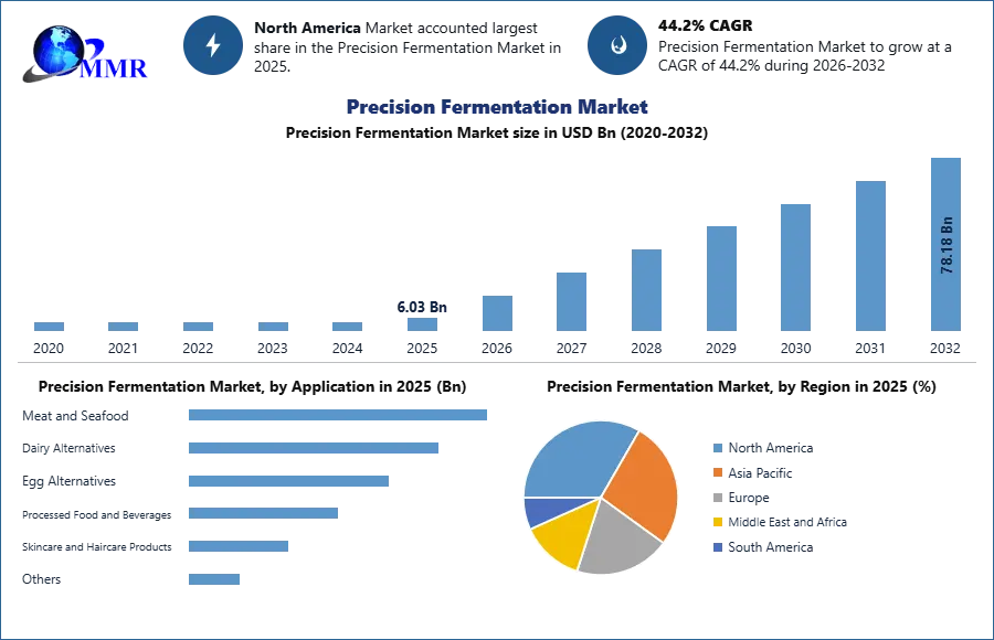 Precision Fermentation Market size was valued at USD 6.03 Bn. in 2025 and the total Precision Fermentation revenue is expected to grow by 44.2% from 2026 to 2032, reaching nearly USD 78.18 Bn.