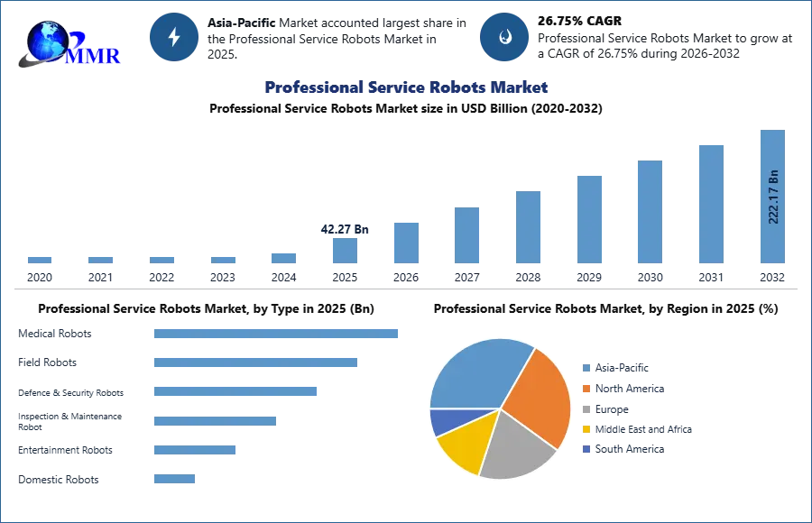 The Professional Service Robots Market size was valued at USD 42.27 billion in 2025, and the total revenue is expected to grow at a CAGR of 26.75% from 2026 to 2032, reaching nearly USD 222.17 billion.