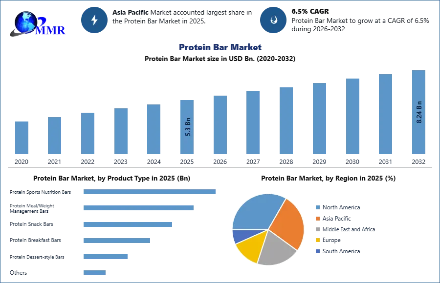 The Global Protein Bar Market has witnessed robust expansion, driven by rising health consciousness, increased adoption of active lifestyles, and growing demand for convenient nutrition. The Protein Bar Industry, valued at USD 5.3 billion in 2025, is expected to reach USD 8.25 billion by 2032, with a CAGR of 6.5% (2026–2032).