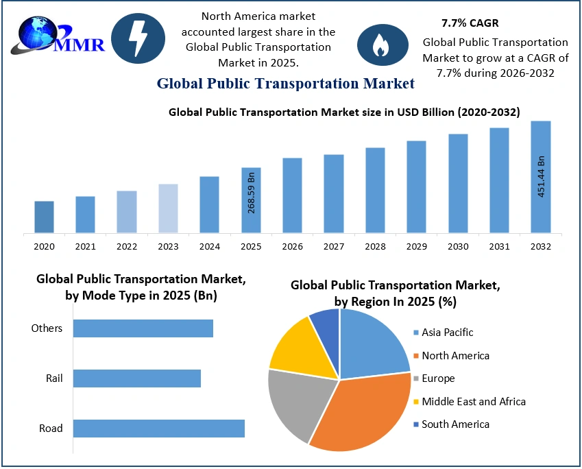 The Public Transportation Market size was valued at USD 268.59 Billion in 2025 and the total Public Transportation revenue is expected to grow at a CAGR of 7.7% from 2026 to 2032, reaching nearly USD 451.44 Billion by 2032.