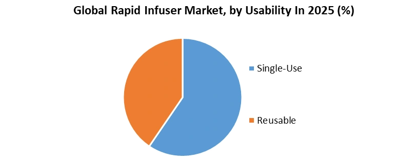 By Product Type: Rapid infusers are classified as trolley-mounted devices, accessories, or handheld devices, depending on their product type. Trolley-mounted devices accounted for a major portion of the market in 2025 and are likely to continue to develop at a significant rate in the near future. Because of their portability and ease of use, these devices have been a popular choice for operations in professional healthcare settings, fuelling market expansion over the forecast period. By End-users: In 2025, the hospital segment had the biggest market xx% share, and it is predicted to grow rapidly in the future years. Major drivers driving expansion include public and private sector investments in healthcare infrastructure, as well as the usage of fast infusers in premium hospitals, emergency care units, and intensive care units.By Usability: Single-use and reusable rapid infusers are the two types based on their usability. Owing to high-cost advantages for healthcare organizations, reusable fast infuser devices are expected to be in great demand in the near future. But the current crisis is expected to hinder sales of reusable options in favour of single-use alternatives in the immediate future.