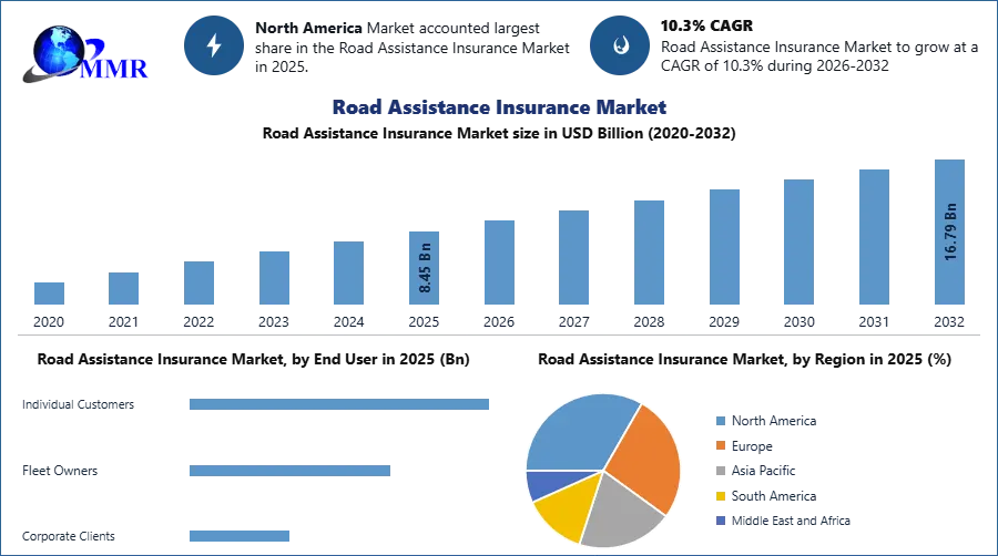 Road Assistance Insurance Market size was valued at USD 8.45 Bn. in 2025 and the total Road Assistance Insurance revenue is expected to grow at a CAGR of 10.3% from 2026 to 2032, reaching nearly USD 16.79 Bn.