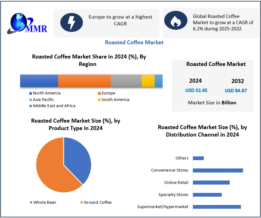 Global Roasted Coffee Market Report Coverage Details Base Year: 2024 Forecast Period: 2025-2032 Historical Data: 2019 to 2024 Market Size in 2024: USD 52.45 Bn. Forecast Period 2025 to 2032 CAGR: 6.2% Market Size in 2032: USD 84.87 Bn. Segments Covered: by Product Type Whole Bean Ground Coffee by Roast Type Light Roast Medium Roast Dark Roast by Packaging Type Pouches Jars Pods & Capsules Others by End-Use Household HoReCa Offices & Institutions by Distribution Channel Supermarkets/Hypermarkets Specialty Stores Online Retail Convenience Stores Others Roasted Coffee Market, by Region