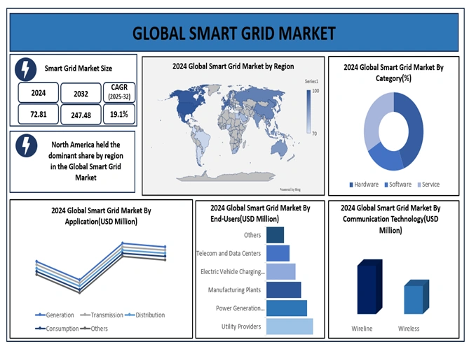 Global Smart Grid Market Report Coverage Details Base Year: 2024 Forecast Period: 2025-2032 Historical Data: 2019 to 2024 Market Size in 2024: USD 72.81 Mn. Forecast Period 2025 to 2032 CAGR: 19.1% Market Size in 2032: USD 247.48 Mn. Segments Covered: by Technology SoftwareAdvancement Distribution Management SystemEnergy Management System (EMS)Meter Data Management SystemSCADA SystemsSmart Grid SecurityOthersHardwareSmart MetersSensorsProgrammable Logic Controller (PLC)OthersServicesConsultingDeployment and IntegrationSupport and MaintenanceOthersby Application Generation Transmission Distribution Consumption Others by End Users Utility Providers Power Generation Companies Manufacturing Plants Electric Vehicle Charging Infrastructure Providers Telecom and Data Centers Others by Communication Technology Wireline Wireless Smart Grid Market, by Region