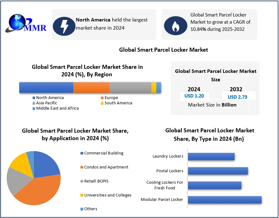 Global Smart Parcel Locker Market Report Coverage Details Base Year: 2024 Forecast Period: 2025-2032 Historical Data: 2019 to 2024 Market Size in 2024: USD 1.20 Bn. Forecast Period 2025 to 2032 CAGR: 10.84% Market Size in 2032: USD 2.73 Bn. Segments Covered: by Component Hardware Software Services by Type Modular Parcel Locker Cooling Lockers for Fresh Food Postal Lockers Laundry Lockers by Application Commercial Building Condos and Apartments Retail BOPIS Universities and Colleges Others by Deployment Indoor Outdoor Smart Parcel Locker Market, by Region