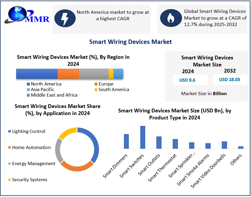 Global Smart Wiring Devices Market Report Coverage Details Base Year: 2024 Forecast Period: 2025-2032 Historical Data: 2019 to 2024 Market Size in 2024: USD 9.6 Bn. Forecast Period 2025 to 2032 CAGR: 12.7% Market Size in 2032: USD 18.03 Bn. Segments Covered: by Product Type Smart Dimmers Smart Switches Smart Outlets Smart Thermostat Smart Sprinkler Controllers Smart Smoke Alarms Smart Video Doorbells Others by Connectivity technology Wi-Fi Zigbee Z-Wave Bluetooth by Application Lighting Control Home Automation Energy Management Security Systems by End-User Industrial Residential Commercial Smart Wiring Devices Market, by Region