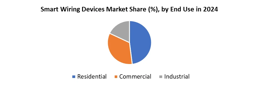 Based on Product Type, the Smart Wiring Devices Market is categorized into Smart Dimmers, Switches, Outlets, thermostats, sprinkler controllers, smoke alarms, video doorbells and others. The smart switches segment held the largest market share in 2024. Growth of urbanization, increasing penetration of the Internet and rapid advancement in the Internet of Things (IoT) is facilitating the smart switches segment growth in the market during upcoming years. Smart switches use radio frequency waves to transmit signals and communicate each other and control switches by accessing WIFI with the help of smartphones and tablets. Smart switches work through WI-FI, Bluetooth, Zigbee, Z-wave, proprietary system, and lighting control of the smart switch. It saves energy and feels more comfortable and secure and the adoption of such technology boosts Smart Wiring Devices Market growth. Leviton announced that its second-gen Decora Wi-Fi 2nd Gen Dimmer and Switch have gained Matter support in early 2024. Also makes a dimmer-only version and an on-off-only version of this switch, among others. For those with older homes, Leviton has the Decora No-Neutral Dimmer ($49, Amazon (opens in new tab)) and a No-Neutral Switch ($44, Amazon (opens in new tab)), which work with the Decora Smart Wi-Fi Bridge ($20, Amazon (opens in new tab)); all are compatible with Alexa, HomeKit, and Google Home, and look to be good, less expensive alternatives to Lutron's lineup.Based on End Use, the Smart Wiring Devices Market is segmented into industrial, commercial and residential. The residential segment held the largest market share in the global Smart Wiring Devices Market in 2024. The segment growth is driven by more people using home security systems devices, which employ these gadgets as sporadic cameras with sound-activated feature facilities. In-home automation projects that let users operate various appliances through computers or smartphones employing Z-Wave technology or the ZigBee protocol (LIR).