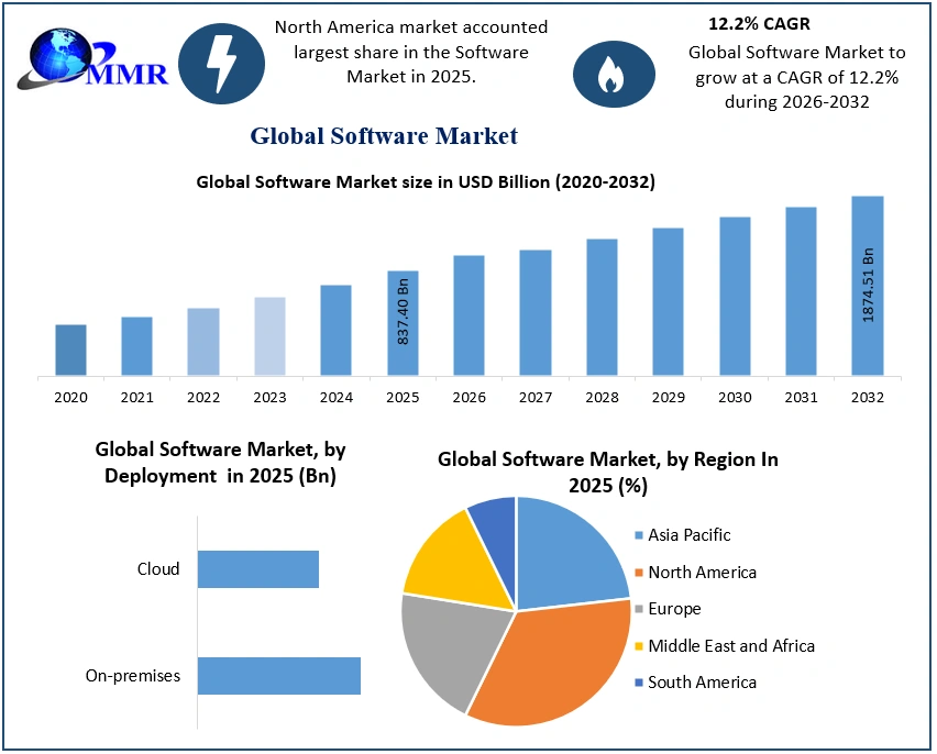 Software Market Report Coverage Details Base Year: 2025 Forecast Period: 2026-2032 Historical Data: 2020 to 2025 Market Size in 2025: USD 837.40 Bn. Forecast Period 2026 to 2032 CAGR: 12.2% Market Size in 2032: USD 1874.51 Bn. Segments Covered: by Type Application Software Enterprise resource planning (ERP) Customer Relationship Management (CRM) Supply Chain Management (SCM) Enterprise Collaboration Software Enterprise Content Management (ECM) Software Education Software Others System Infrastructure Software Network Management Systems (NMS) Storage Software Security Software Development and Deployment of Software Enterprise Data Management (EDM) Business Analytics & Reporting Tools Application Servers Integration & Orchestration Middleware Data Quality Tools Productivity Software Office Software Creative Software Others Others by Deployment On-premises Cloud by Enterprise Size Small & Medium Enterprises Large Enterprises by Vertical IT & Telecom BFSI Retail Government/Public Sector Energy & Utilities Healthcare Others Software Market, by Region