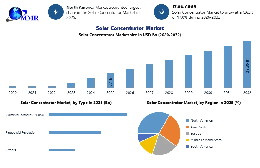 Solar Concentrator Market is expected to reach USD 22.35 Bn by 2032 from USD 7.1 Bn in 2025, at a CAGR of 17.8% during the forecast period.