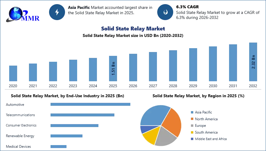 Solid State Relay Market was valued at USD 1.51 Billion in 2025 and the total revenue is expected to grow at a CAGR of 6.3% from 2026 to 2032, reaching nearly USD 2.32 Billion.