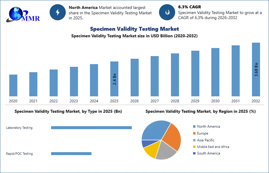 Specimen Validity Testing Market was valued at US$ 2.4 Bn. in 2025 and expected to grow at US$ 3.68 Bn. in 2032. Global Specimen Validity Testing Market size is expected to grow at a CAGR of 6.3% through the forecast period.