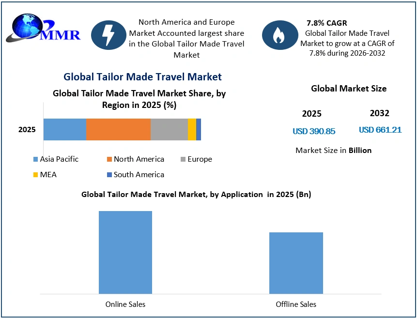 Tailor Made Travel Market Report Coverage Details Base Year: 2025 Forecast Period: 2026-2032 Historical Data: 2020 to 2025 Market Size in 2025: USD 390.85 Bn. Forecast Period 2026 to 2032 CAGR: 7.8% Market Size in 2032: USD 661.21 Bn. Segments Covered: by Type Culture and History Honeymoon Exploration Food and Cooking Relaxation Others by Application Online Sales Offline Sales Tailor Made Travel Market, by Region: