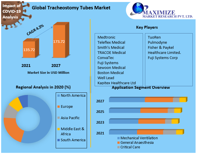 • Medtronic • Teleflex Medical • Smith's Medical • TRACOE Medical • ConvaTec • Fuji Systems • Sewoon Medical • Boston Medical • Well Lead • TuoRen • Pulmodyne • Fisher & Paykel Healthcare Limited. • Fuji Systems Corp • Kapitex Healthcare Ltd Frequently Asked Questions: 1] Which region is expected to hold the highest share in the Tracheostomy Tubes Market? Ans. North America is expected to hold the highest share in the Tracheostomy Tubes Market. 2] Who are the top key players in the Tracheostomy Tubes Market? Ans. Medtronic, Teleflex Medical, Smith's Medical, TRACOE Medical, and ConvaTec are the top key players in the Tracheostomy Tubes Market. 3] Which segment holds the largest market share in the Tracheostomy Tubes market by 2029? Ans. Mechanical Ventilation segment hold the largest market share in the Tracheostomy Tubes market by 2029. 4] What is the market size of the Tracheostomy Tubes market by 2029? Ans. The market size of the Tracheostomy Tubes market is expected to reach US $188.61 Mn. by 2029. 5] What was the market size of the Tracheostomy Tubes market in 2022? Ans. The market size of the Tracheostomy Tubes market was worth US $141.42 Mn. in 2022. 6] Which Company is expected to hold the highest share in the Tracheostomy Tubes Market? Ans. Medtronic is expected to hold the highest share in the Tracheostomy Tubes Market.