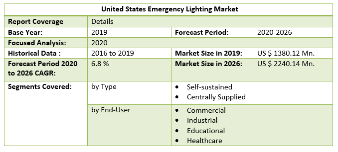 United States Emergency Lighting Market size was valued at US$ 1380.12 Mn in 2020 and the total revenue is expected to grow at 6.8% through 2020 to 2026, reaching nearly US$ 2240.14 Mn.To know about the Research Methodology :- Request Free Sample Report The United States Emergency Lighting market report is a comprehensive analysis of the industry, market, and key players. The report has covered the market by demand and supply-side by segments. The United States Emergency Lighting report also provides trends by market segments, technology, and investment with a competitive landscape.
