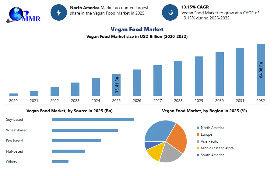 Vegan Food Market was valued at USD 35.41 Bn in 2025. Global Vegan Food Market size is expected to grow at a CAGR of 13.15% through the forecast period 2026 to 2032.
