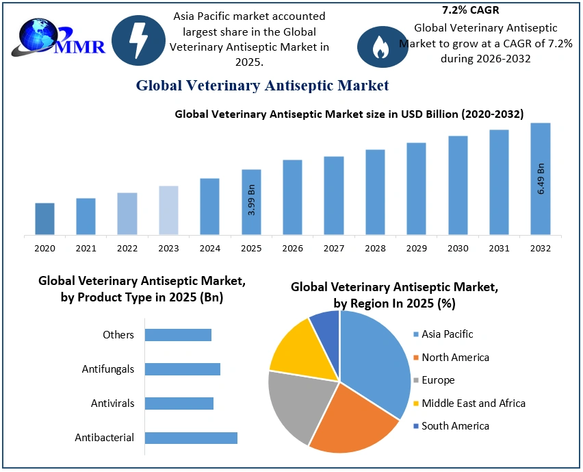 Veterinary Antiseptic Market Report Coverage Details Base Year: 2025 Forecast Period: 2026-2032 Historical Data: 2020 to 2025 Market Size in 2025: USD 3.99 Bn. Forecast Period 2026 to 2032 CAGR: 7.2 % Market Size in 2032: USD 6.49 Bn. Segments Covered: by Animal Type Cattle Poultry Cats Dogs Other Animals by Product Type Antibacterial Antivirals Antifungals Others by Mode of Administration Oral Topical Others Veterinary Antiseptic Market, by Region
