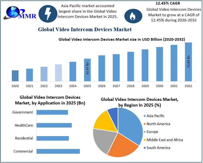 Global Video Intercom Devices Market Report Coverage Details Base Year: 2025 Forecast Period: 2026-2032 Historical Data: 2020 to 2025 Market Size in 2025: USD 32.47 Bn. Forecast Period 2026 to 2032 CAGR: 12.45% Market Size in 2032: USD 73.83 Bn. Segments Covered: by Device Type Door entry systems Video baby monitors Handheld devices by Access Control Proximity cards Fingerprint readers Password access Bluetooth control by Application Commercial Residential HealthCare Government Video Intercom Devices Market, by Region