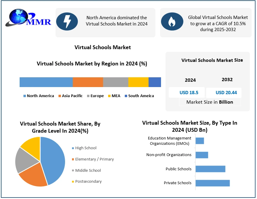 Global Virtual Schools Market Report Coverage Details Base Year: 2024 Forecast Period: 2025-2032 Historical Data: 2019 to 2024 Market Size in 2024: USD 18.5 Bn. Forecast Period 2025 to 2032 CAGR: 10.5% Market Size in 2032: USD 20.44 Bn. Segments Covered: by Grade Level Elementary / Primary Middle School High School Postsecondary by Type Public Schools Private Schools Non-profit Organizations Education Management Organizations (EMOs) by Curriculum General Education STEM / AP / Advanced Learning Remedial / Special Needs / Skill-Development Vocational by Learning Model Fully Virtual Hybrid virtual Supplemental / Part-time Virtual Virtual Schools Market by Region: