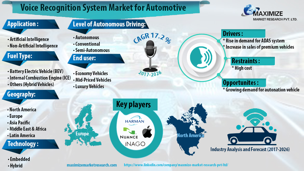Voice Recognition System Market is expected to grow at a CAGR of 17.9% during the forecast period and is expected to reach US$ 27.45 Bn by 2026. The report includes the analysis of impact of COVID-19 lock-down on the revenue of market leaders, followers, and disrupters. Since lock down was implemented differently in different regions and countries, impact of same is also different by regions and segments. The report has covered the current short term and long term impact on the market, same will help decision makers to prepare the outline for short term and long term strategies for companies by regionTo know about the Research Methodology:-Request Free Sample Report Voice recognition also referred as speech recognition is a system that translates the analog waves of human voice into digital data by sampling the sound and to convert speech to on-screen text or a computer command, a computer has to go through several complex steps. Voice recognition is an alternative to typing on a keyboard in order to operate a device, perform commands, or write without having to use a keyboard, mouse, or press any buttons; basically a computer software program or a hardware device with the ability to decode the human voice. Voice recognition is a process of providing a fairly natural and intuitive way of controlling the simulation while allowing the user's hands to remain free. The main drive of introducing voice recognition within an automotive sector is for simplifying the life of both driver and passenger traveling in a vehicle along with making the user-friendly operating system. This helps in performing some actions using the speech commands by the driver or the passengers like open/close doors, switch on/off headlamp along with indicating the signal of the vehicle and more. Voice recognition system in automotive comprises of control of communication systems assimilated in the car infotainment system including telephone, audio devices and endpoint inputs for navigation. This system will enable in achieving “hands-free,” “eyes-free” operation mode. The high cost of these high-end voice recognition systems will further restrain the market growth in the near future. However, the cost of the voice recognition system is expected to decrease in the upcoming years. Higher adoption rate by different vehicle manufacturers to provide passenger cars with voice recognition system will also result in higher demand for voice recognition system and its market for automotive during the forecast period. APAC is projected to be one of the fastest-growing regions in the Voice Recognition System Market for Automotive by 2026. China, Japan, India, and South Korea are some of the major regions that are contributing to the overall growth of voice recognition systems in APAC. A rise in adoption of advanced technologies related to automotive electronics along with a high presence of automotive manufacturers in APAC is some of the major factors that are driving the market.