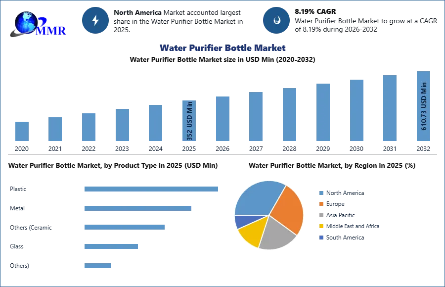 Water Purifier Bottle Market size was valued at USD 352 Mn. in 2025, and the Water Purifier Bottle Market revenue is expected to grow at a CAGR of 8.19% from 2026 to 2032, reaching nearly USD 610.73 Mn.