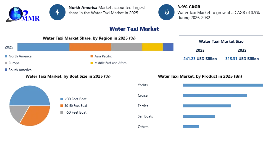 The Water Taxi Market size was valued at USD 241.23 Bn. in 2025 and the total Water Taxi revenue is expected to grow at a CAGR of 3.9% from 2026 to 2032, reaching nearly USD 315.31 Bn.
