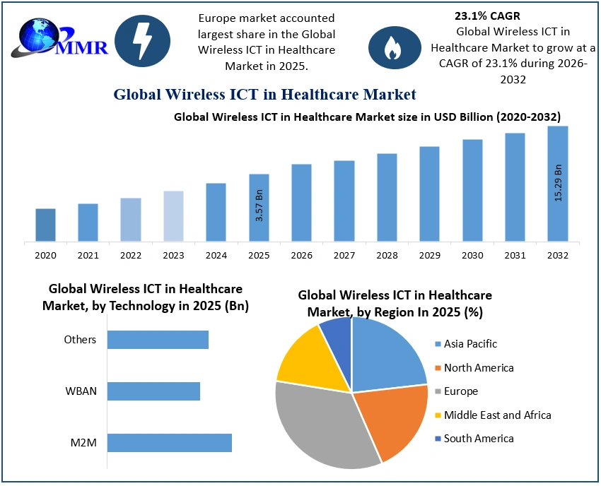 Wireless ICT in Healthcare Market Report Coverage Details Base Year: 2025 Forecast Period: 2026-2032 Historical Data: 2020 to 2025 Market Size in 2025: USD 3.57 Bn. Forecast Period 2026 to 2032 CAGR: 23.1% Market Size in 2032: USD 15.29 Bn. Segments Covered: by Technology M2M WBAN Others by End users Hospitals Personal Care Home Care Others Wireless ICT in Healthcare Market, by Region